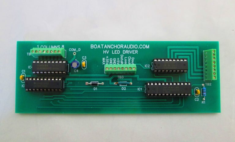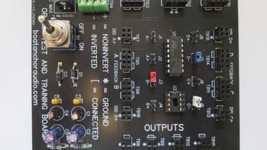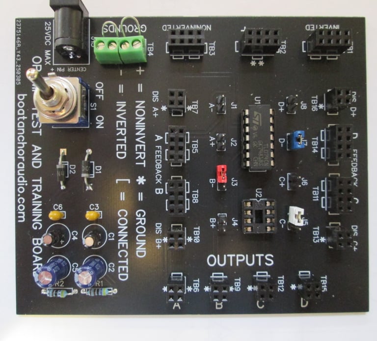 A custom PCB used to design audio circuits using the TL074 or TL072 pin-outs. Also, this PBC is ideal for training in the use of audio OP AMPs.