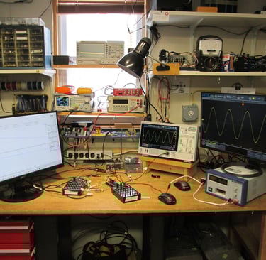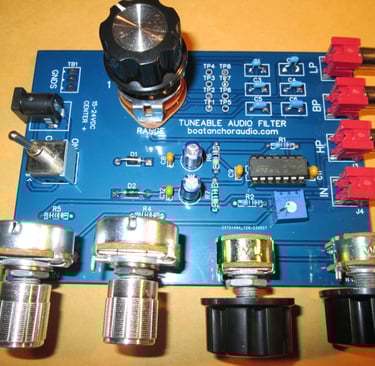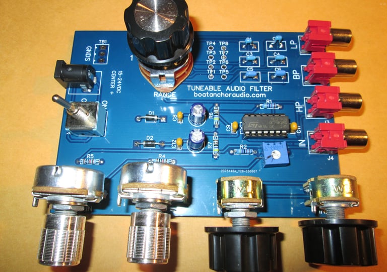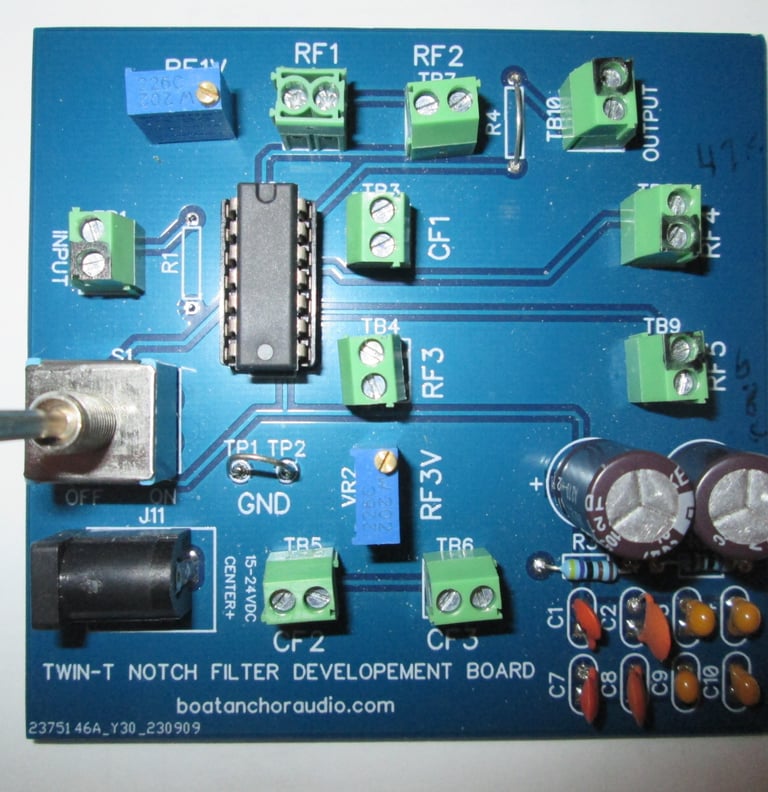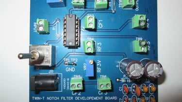 A custom PCB designed for developmental and training purposes using the Twin-T notch filter.